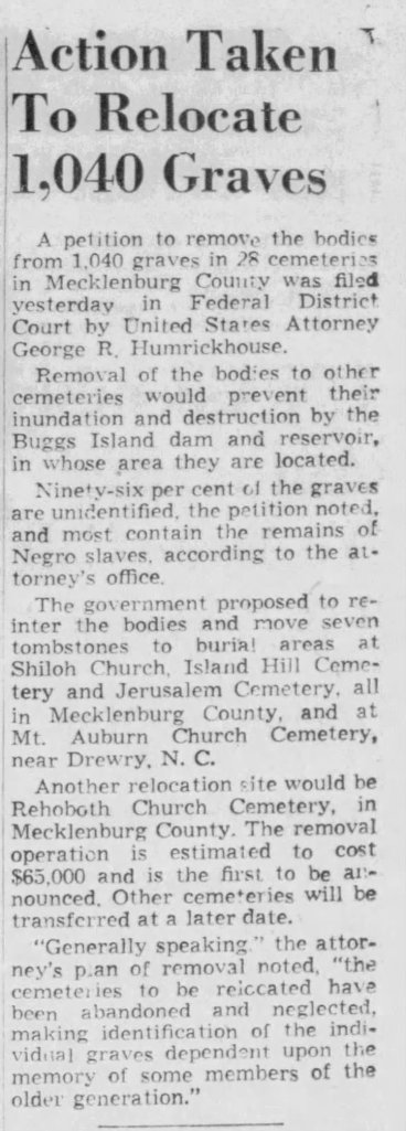 I knew Mays Chapel cemetery moved, but I had no idea 1,040 graves from 28 different cemeteries were moved! And that was only the first permit and early phase of the project. Other cemeteries were moved after this article, including Mays Chapel where my ancestor Tennessee Glover Dortch and her granddaughter Lucy Cliborne were buried. There were also another 80 burials moved to La Crosse cemetery. This article mentions burials moved to Rehoboth Church. There were 2 Rehoboths, one near Boydton, the other in Blackridge. I assume the burials were moved to the Rehoboth near Boydton.