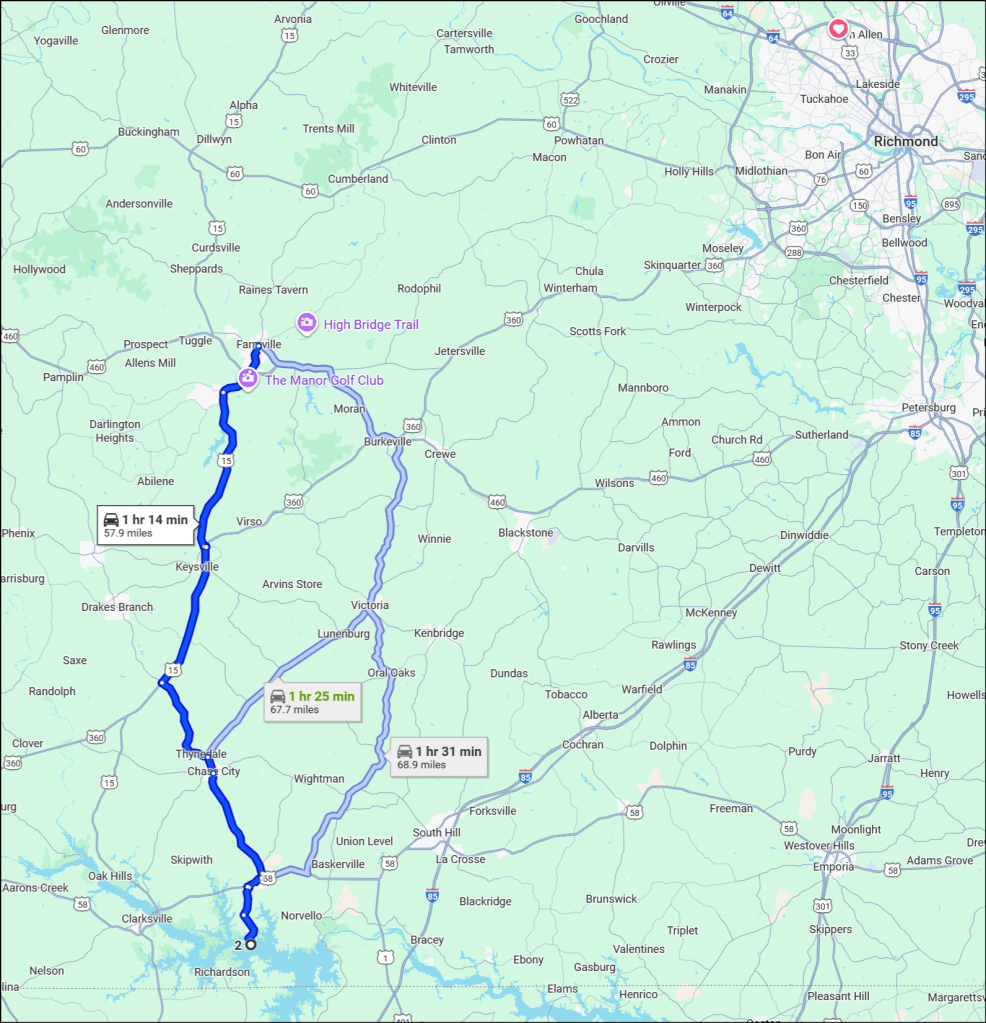 Map showing present day routes to 1) Prince Edward Courthouse, 2) Taylor’s Ferry, and 3) Richmond, upper right corner of this map.
