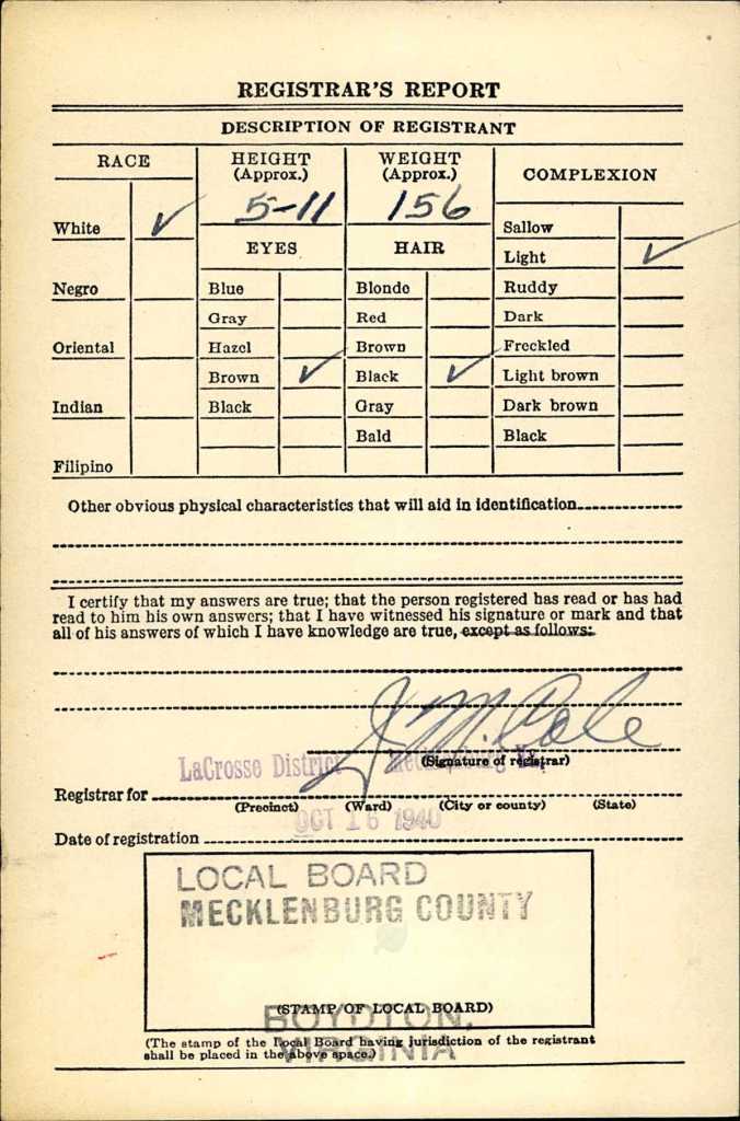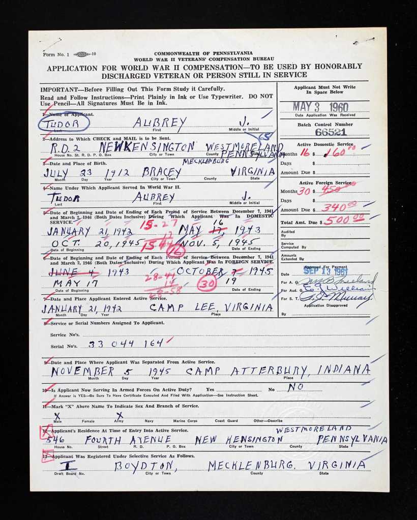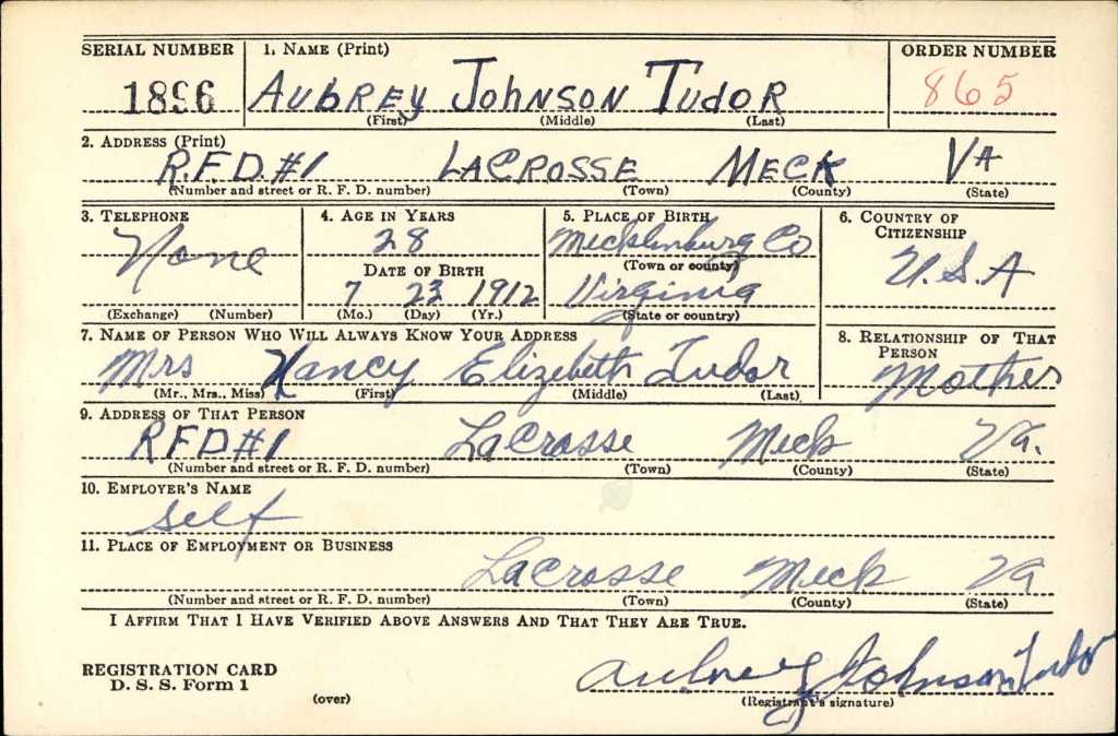 Aubrey Tudor’s registration card says he was 5 feet 11 inches, brown eyes, black hair, light complexion. Aubrey’s brother Charles died in the war. Here’s the veteran burial card for Aubrey, and a benifits application showing military service information: