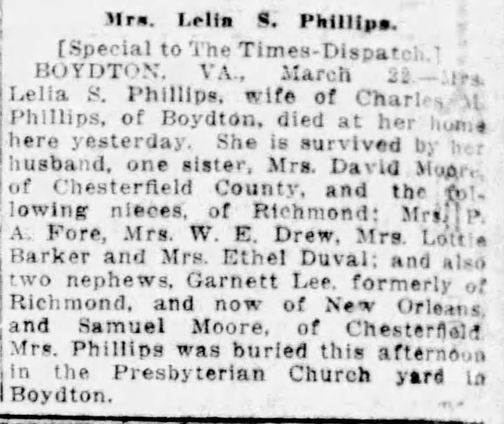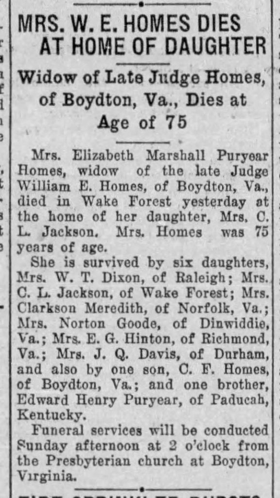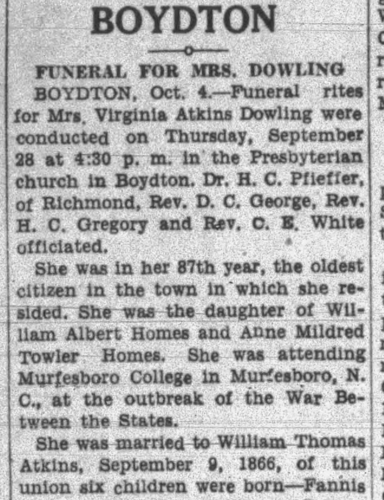 Virginia Homes obituary, full obit viewable at this link. Danville Register & Bee 5 Oct 1933, pg 10. Note: Her father is the one who exchanged land with the Presbyterian Church in 1872.
