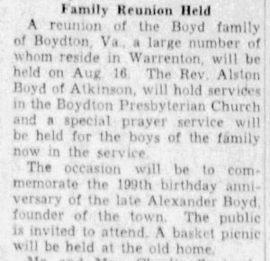23 Aug 1824: Mecklenburg Deed Book 21, page 202. Alexander Boyd and Matilda, his wife, deeded this land 14 Feb 1818 to John W. Lewis and Joel Watkins (now deceased). John W. Lewis sold one acre and 32 poles to the Elders of Boydton Presbyterian congregation for one dollar. Elders: James Maclin, John G. Baptist, Richins Brame, William Boyd, Thomas Atkins & John Jeffress. This land was located in the northeast corner of Boydton.