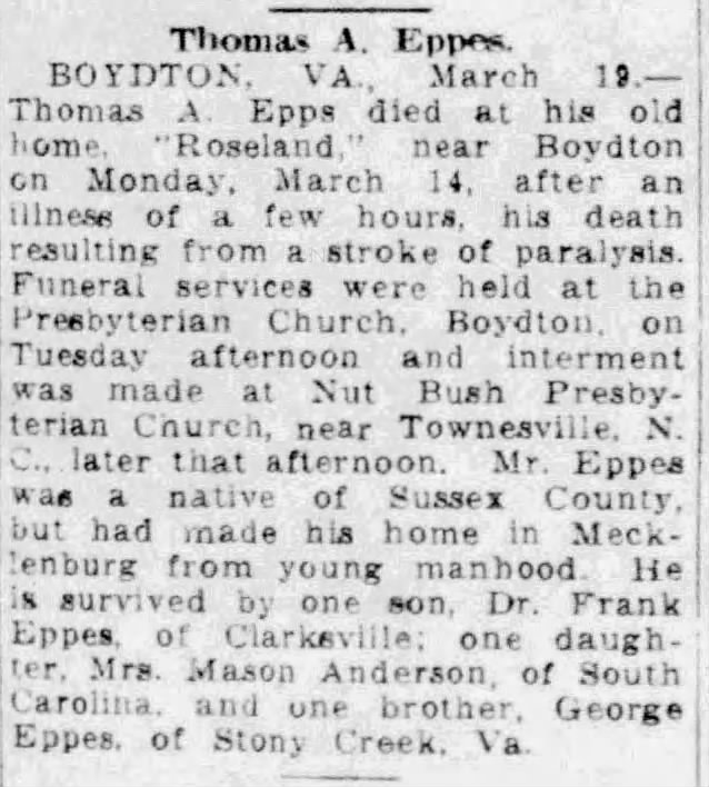 30 Mar 1872: Mecklenburg Deed Book 38 page 565. Thomas H. Boyd, William P. Webb and J. J. Atkins, Elders of the Presbyterian Church at Boydton exchanged land with William A. Homes, and paid one dollar. This parcel of land adjoins the church, at the south east corner of the church lot, up to the northeast corner of the church lot, about 1/4 acre. The land exchange involved land already in the church enclosure.