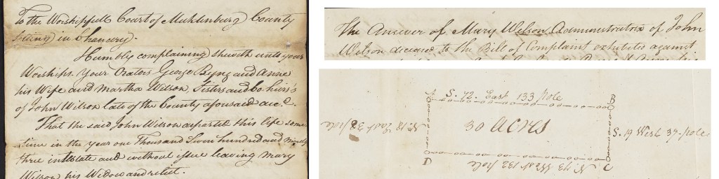 The above images show a 1793 Mecklenburg County, Virginia Chancery case. On the left is the bill also known as the complaint. On the top right is the answer, and on the bottom right is a plat included in the case. The bill and answer often show family relationships. This example case is found digitized here on Library of Virginia’s website.