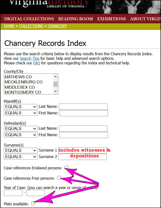 If you would like to search through chancery cases, the index is here (as show in above image). This link shows availability of digitized chancery cases. I usually type the surnames I’m searching for in the “surname” section, because that will include a name anywhere in the case. I also check the boxes, like “plats” when I’m searching for where people lived. If your ancestors were enslaved, or you aren’t sure and they may have been free, chancery cases will be a huge help to you as you search for your ancestors. These records may help you find your ancestors name, and possible relationships, like a mother and her children.