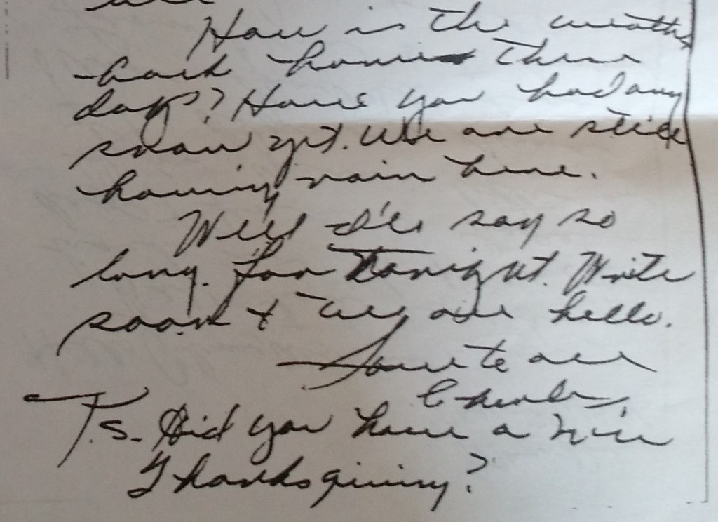 Charles was the son of James Oliver “Ollie” Tudor and Nancy Elizabeth Kidd. Charles was the 6th of 11 children. I met Charles’ younger brother Lindbergh Tudor. Lindbergh told me he had several older brothers in the war, but he was too young to enlist by just a few months. Aubrey Tudor, another sibling of Charles and Lindbergh will be the next veteran spotlight post. I met Elva Kidd White who told me she wrote letters to her cousins oversees every Sunday. (Elva’s father and Charles’ mother were siblings.) She showed me a copy of his last letter home, written 27 Nov 1944. This letter was received, then the next day, the family found out he had died. Here is Charles signature and the last paragraph of the letter, about lots of rain and asking about Thanksgiving: