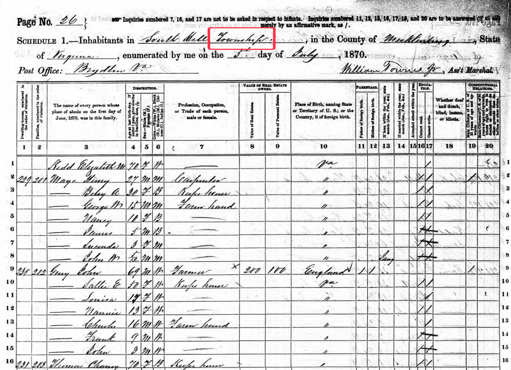 When I saw these place names, I realized the map I previously thought was an 1870 Census enumeration district map, was actually a map showing the townships. I wondered why, when so few maps existed for Mecklenburg, two maps were created less than 7 yeas apart. (The Civil War Gilmer map and this 1870 Finch map below) This record is for my ancestor John Gray, on the 1870 Census. The word “township” is in the place name! The post office was Boydton.