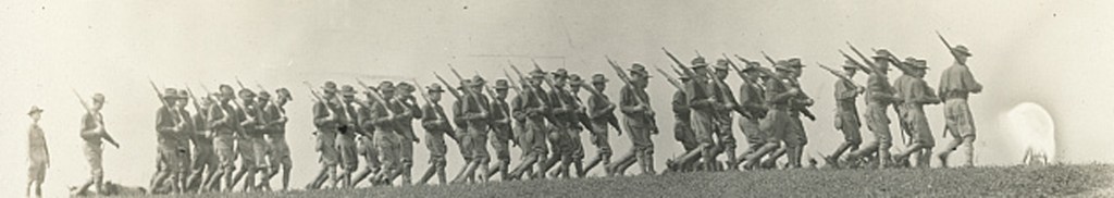 photo credit for heading: 1917 Soldiers marching with rifles in a field, probably a U.S. Army training exercise in the United States. Library of Congress website.