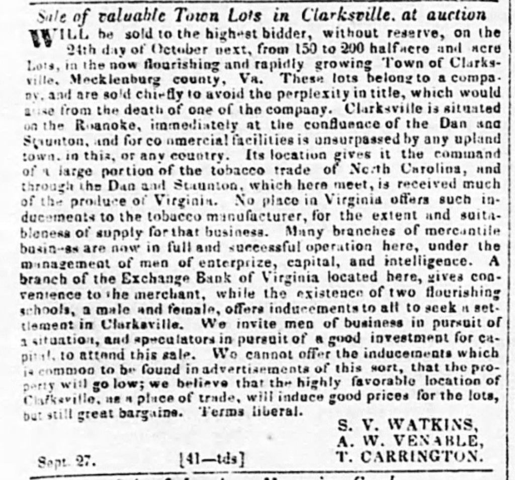 Three years later, this article shows 150 to 200 half acre lots were being sold in the town of Clarksville. Richmond Enquirer, Friday Oct 18, 1839, pg 1. SV Watkins, AW Venable and T. Carrington are selling the land. I thought the descriptions of the town and businesses were really interesting. Also interesting to note that there was a school for boys and a separate school for girls.