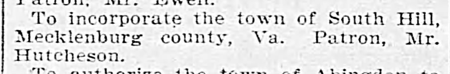 This newspaper clipping about South Hill being incorporated is from the Richmond Times Dispatch, Friday Feb 8, 1901, page 5.