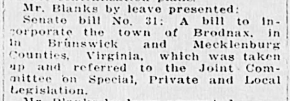 This newspaper clipping about Brodnax being incorporated is from the Richmond Times Dispatch Wednesday January 20, 1915 page 9