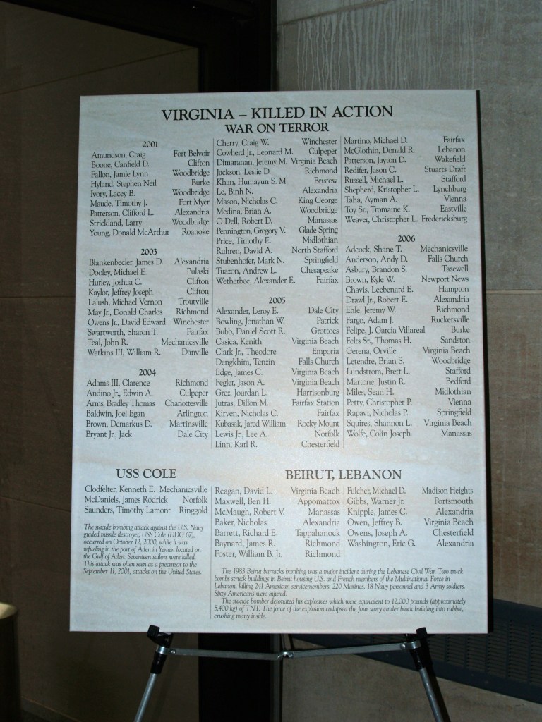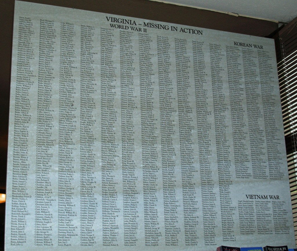All the names of known Virginia veterans, who died in combat from World War II to Vietnam, are on the wall. There is also a research room and visitor center.